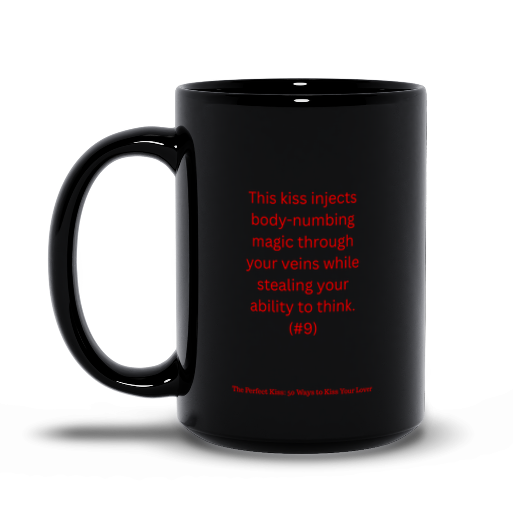 This sleek, LEFT-HANDED ceramic black mug features the iconic lips artwork from The Perfect Kiss: 50 Ways to Kiss Your Lover on one side—and a deliciously provocative quote on the other: